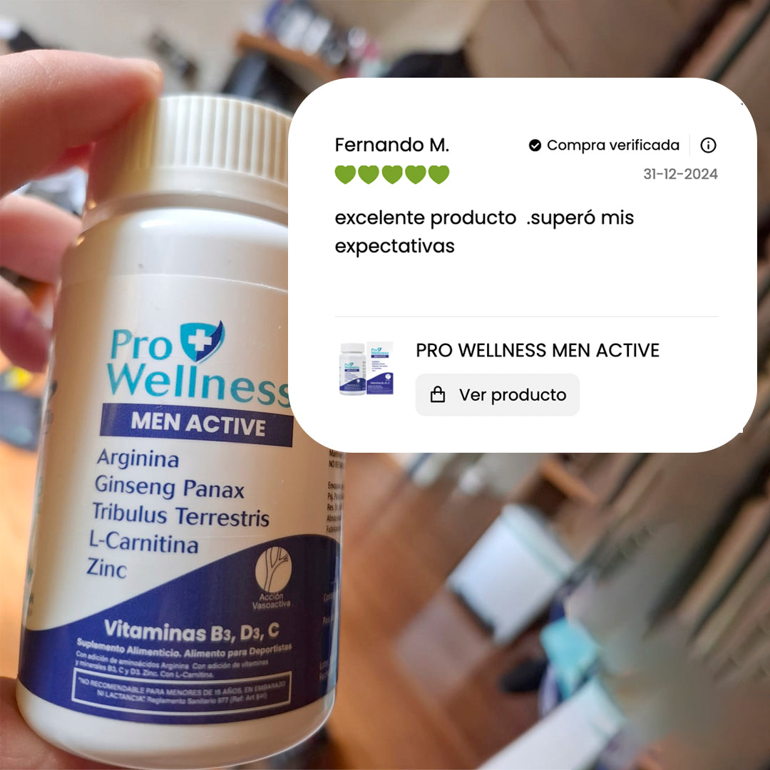 Pro Wellnes Men Active es una fórmula específica que combina ingredientes naturales seleccionados por sus propiedades potenciales para abordar los factores asociados con el bienestar masculino. Entre estos ingredientes se encuentran la arginina, el ginseng, el zinc, el tribulus, la carnitina, la vitamina B3, la vitamina D y la vitamina C. Cada uno de estos componentes ha sido objeto de investigaciones y se ha sugerido que podría desempeñar un papel positivo en la mejora de la circulación sanguínea, la regulación hormonal y la función vascular, aspectos cruciales para una erección saludable.